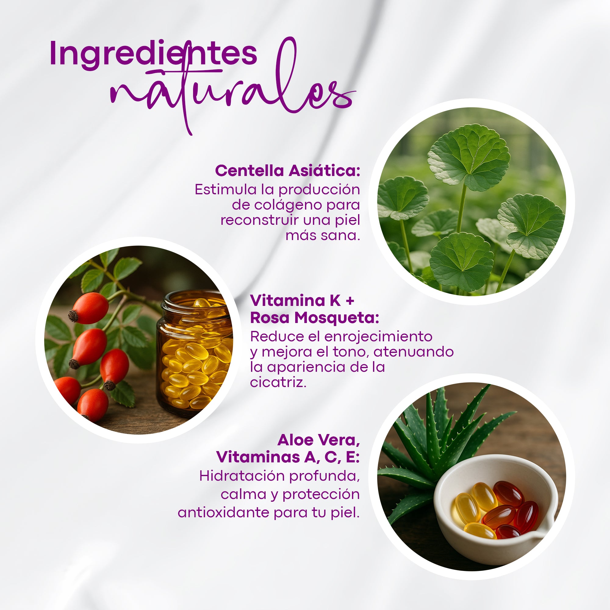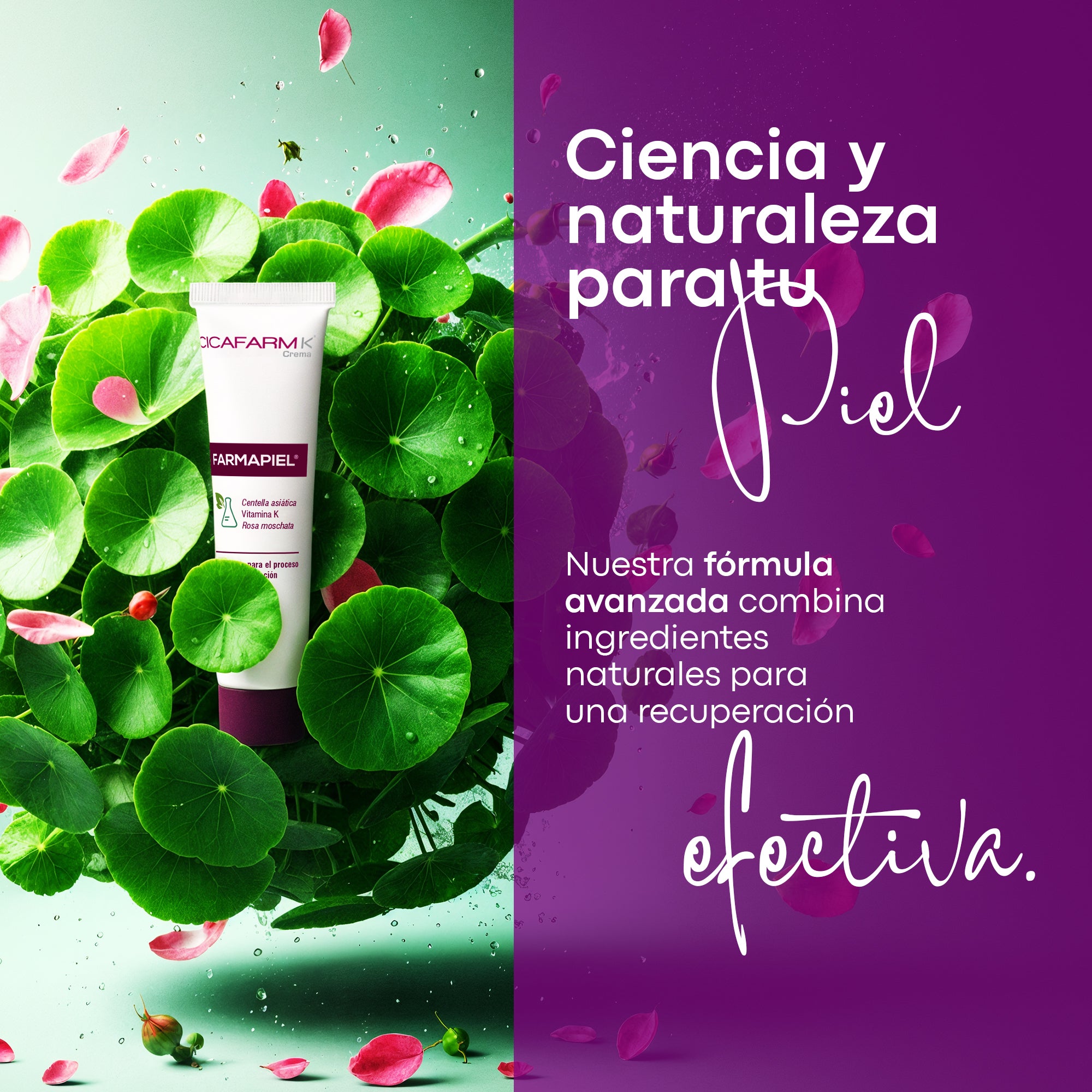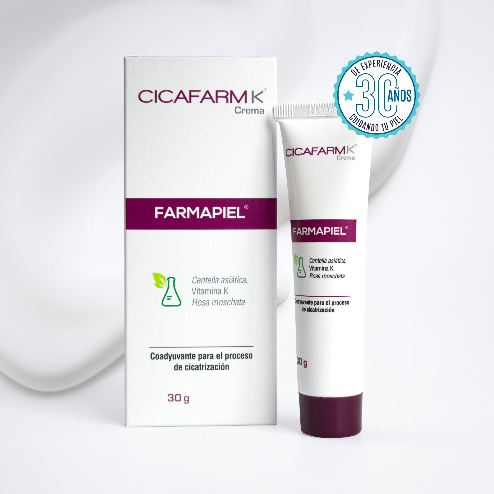 Cicafarm K está formulada con ingredientes como rosa mosqueta, centella asiática y aloe vera, conocidos por su uso en el cuidado de la piel.