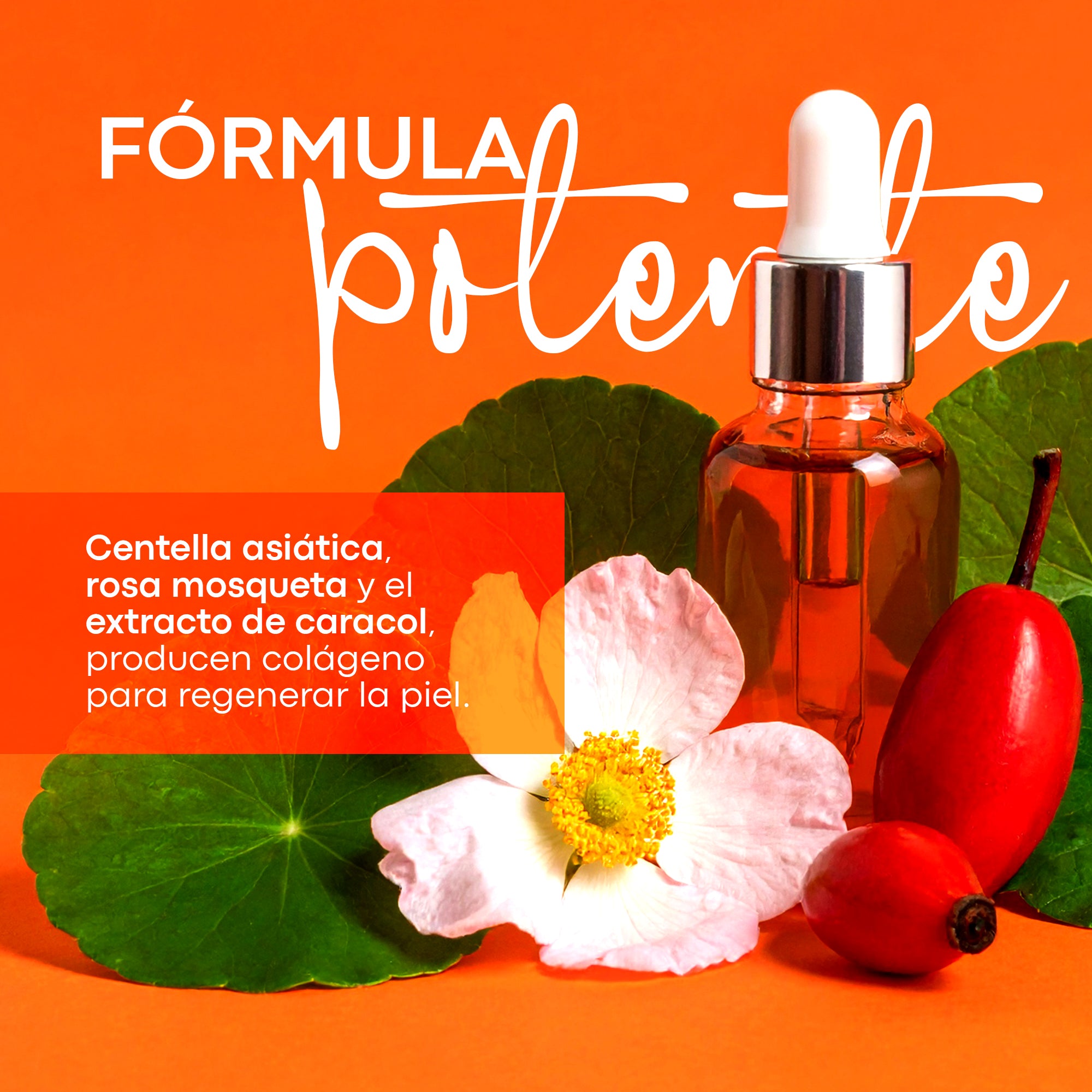 Fórmula con ingredientes conocidos en el cuidado de la piel, como alantoína, extracto de baba de caracol, rosa mosqueta y caléndula.