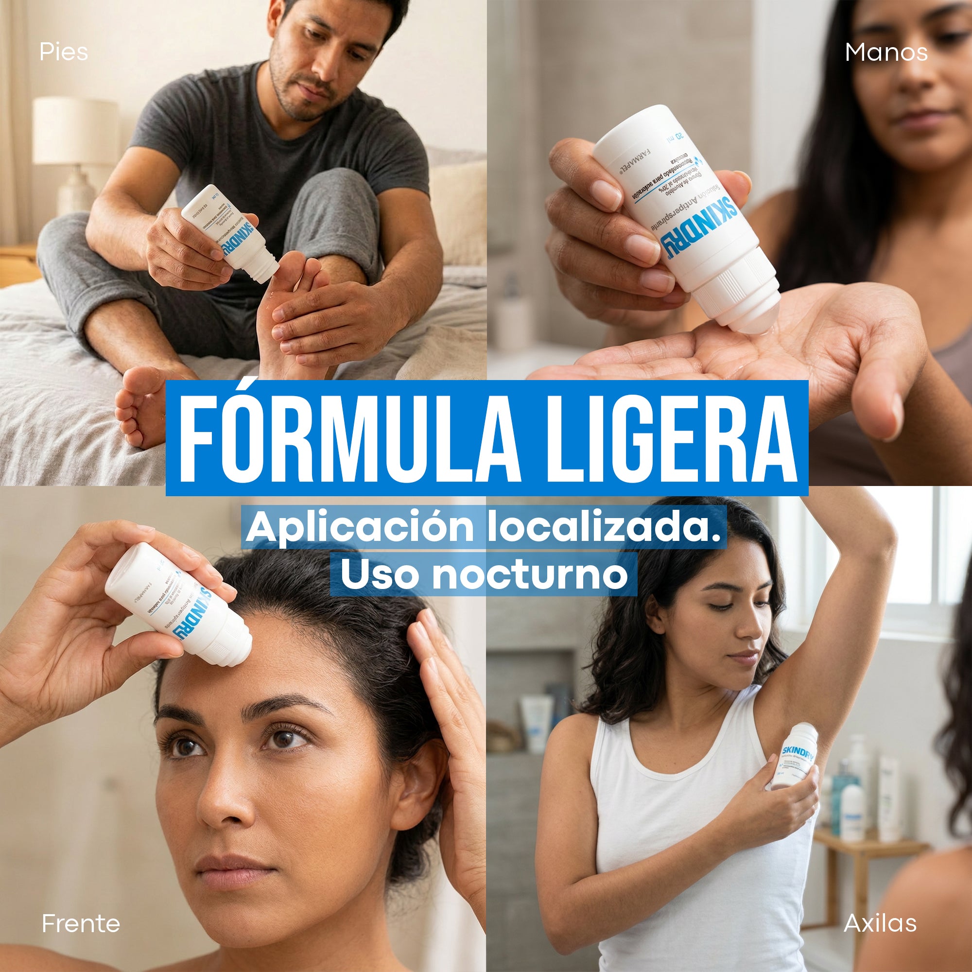 Skindry se presenta en solución con un aplicador en esponja. Para su aplicación, asegúrate de que la piel esté limpia y seca en las áreas deseadas, como axilas, palmas de las manos, espalda, cuero cabelludo o plantas de los pies.