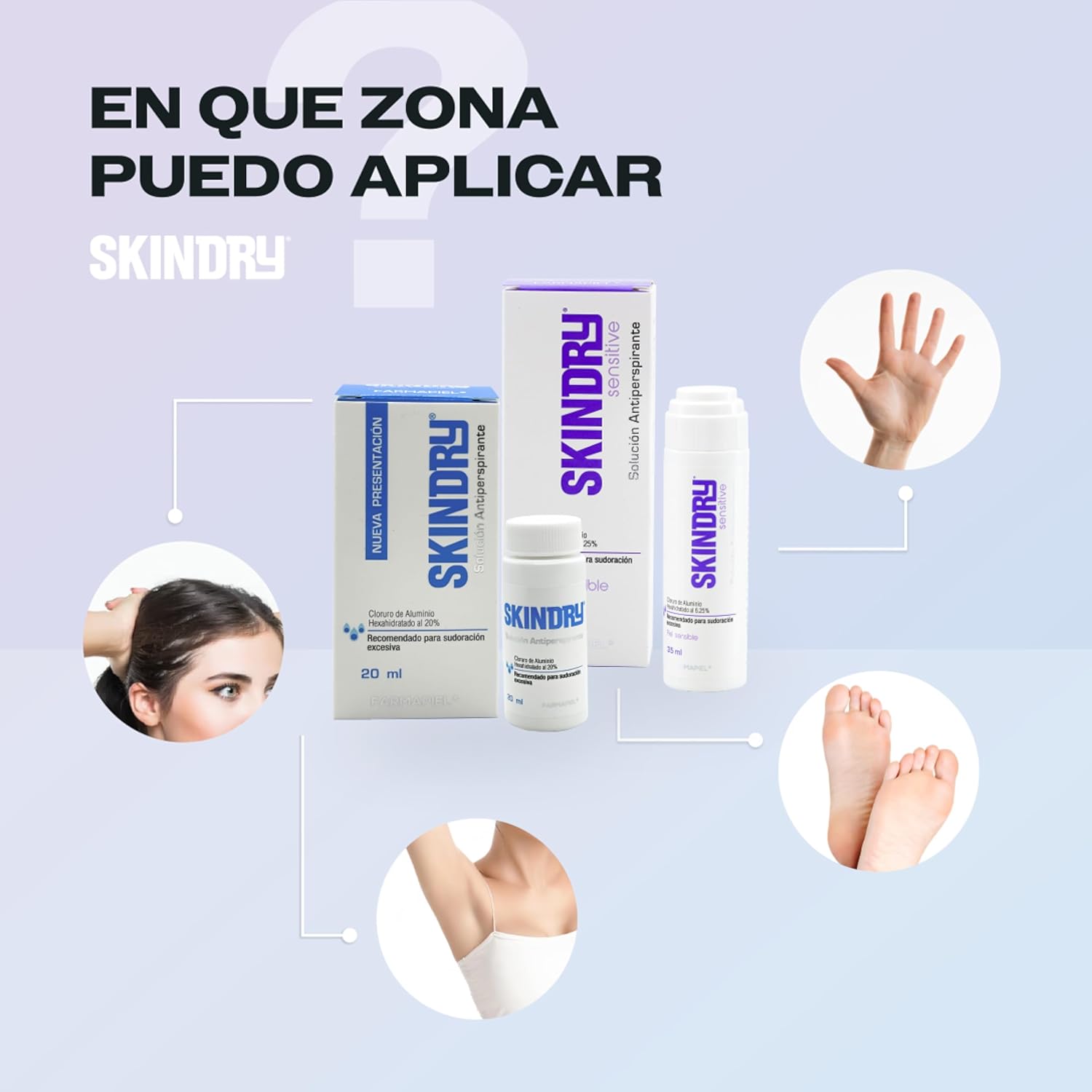 Skindry Sensitive se presenta en solución con un aplicador en esponja. Para su aplicación, asegúrate de que la piel esté limpia y seca en las áreas deseadas, como axilas, palmas de las manos, espalda, cuero cabelludo o plantas de los pies.